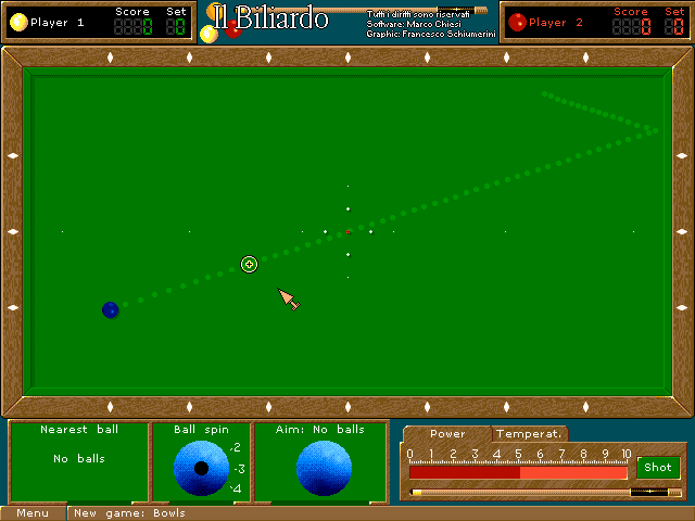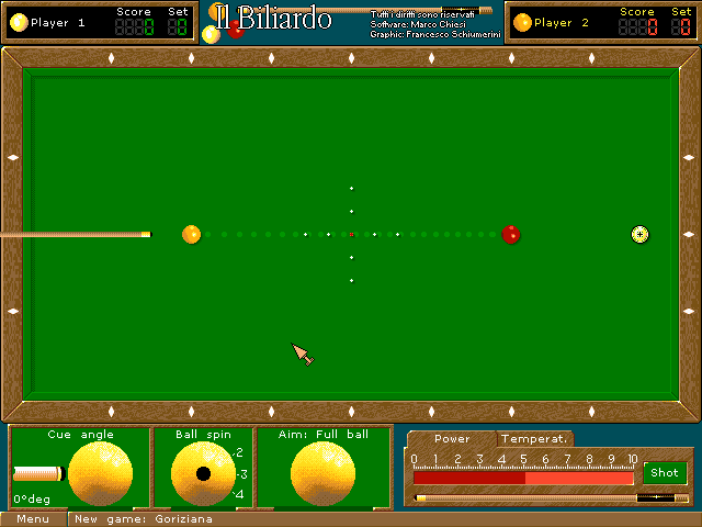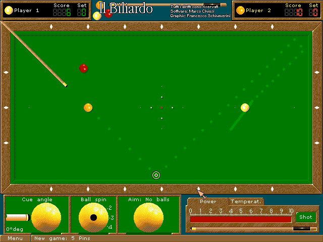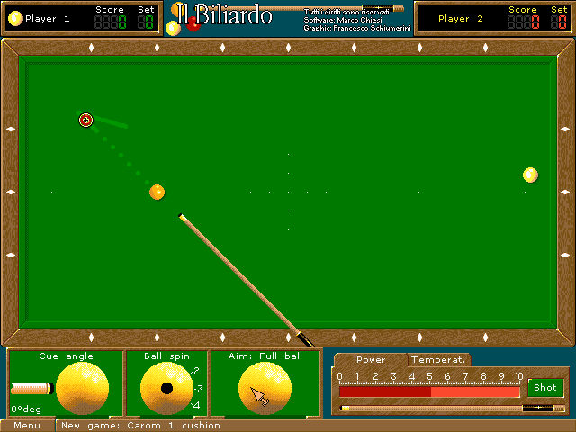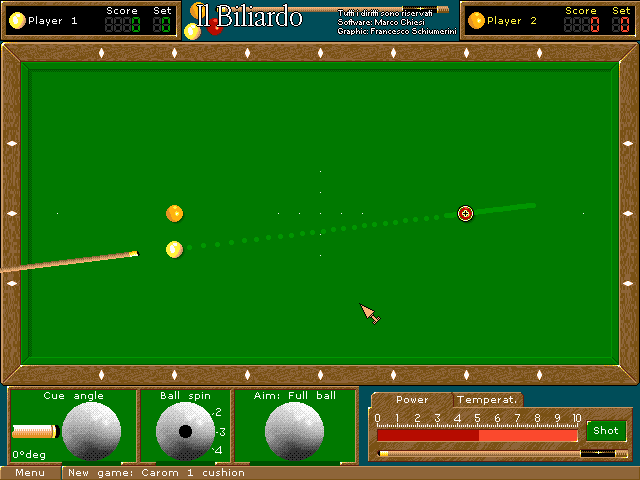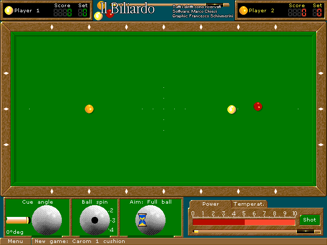 Biliardo 2 was developed using the Allegro library and released as freeware. A Windows-native version is also available. The game interface can switch between English and Italian.