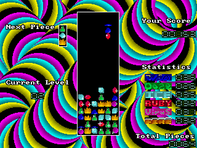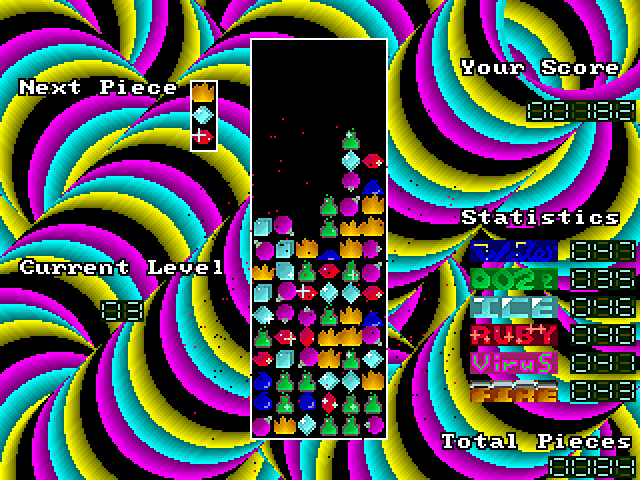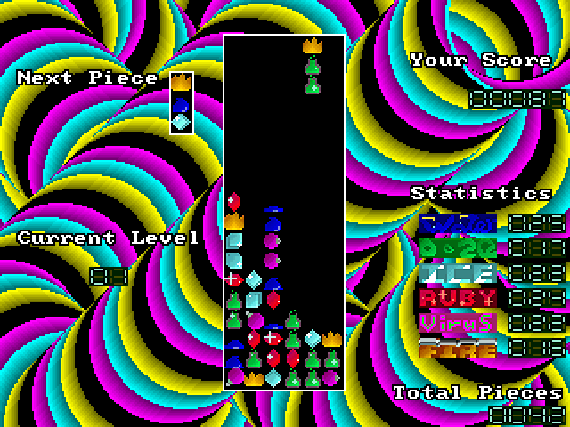 Cool Columns is a fairly straightforward Columns variant that uses the Allegro library and thus offers some nice visual effects. The basic rules are unaltered: sets of three tiles fall from the top of the screen, and the player must arrange three or more tiles of the same type into horizontal, vertical or diagonal lines to make them disappear. You lose if there is no more space on the playing field for new tiles to occupy.