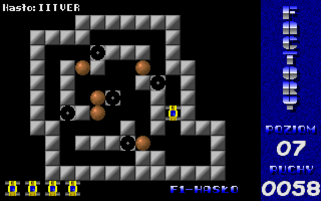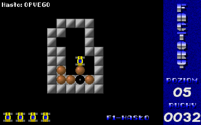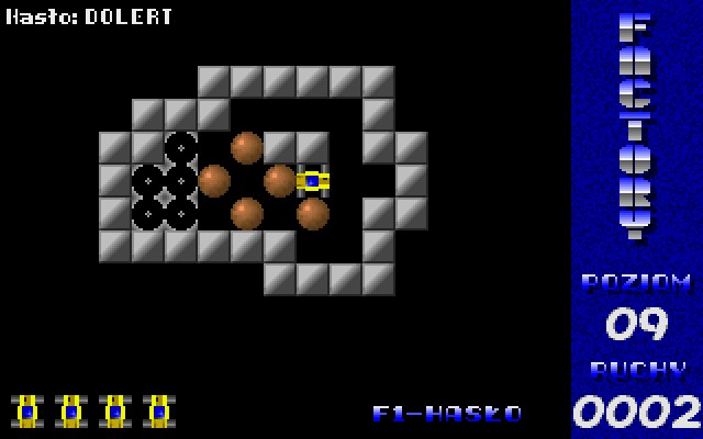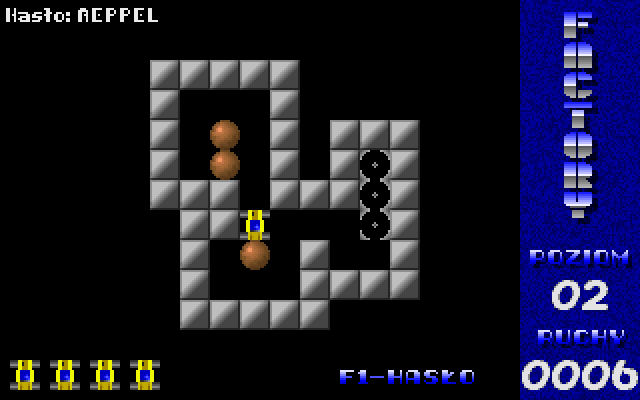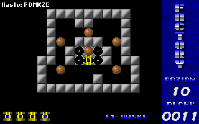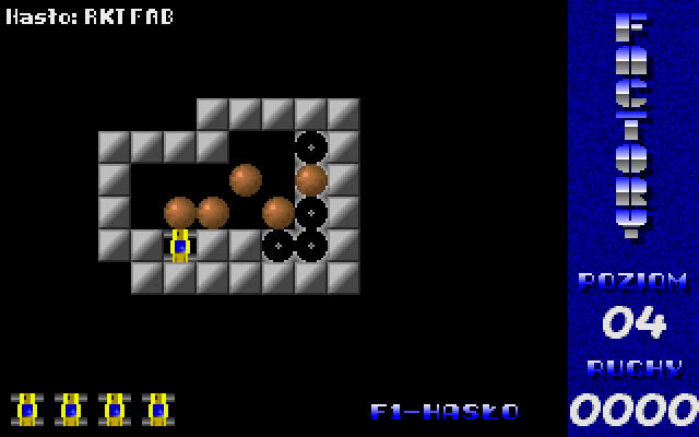 Factory was released as freeware by its author. The game is in Polish, but there's almost no text so that should not be a problem. Press F1 to enter a level password. There are 50 levels in the game.