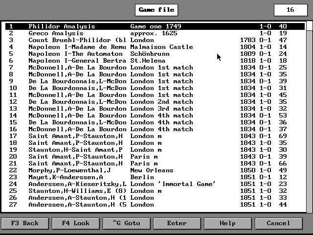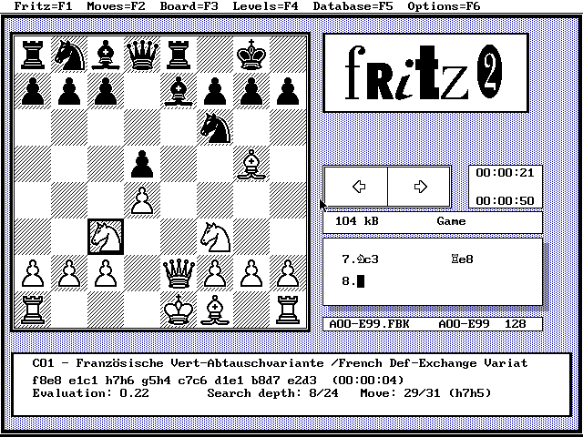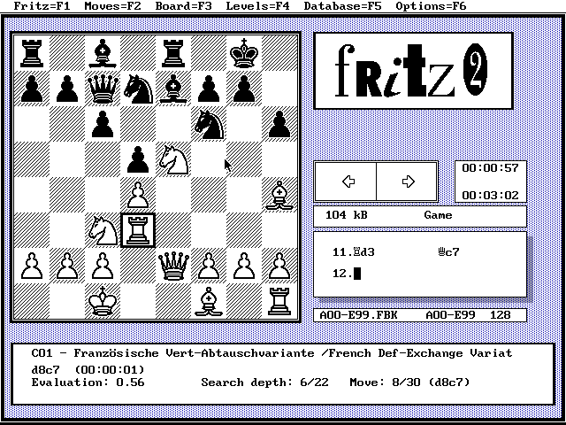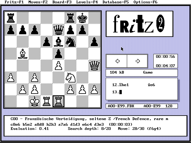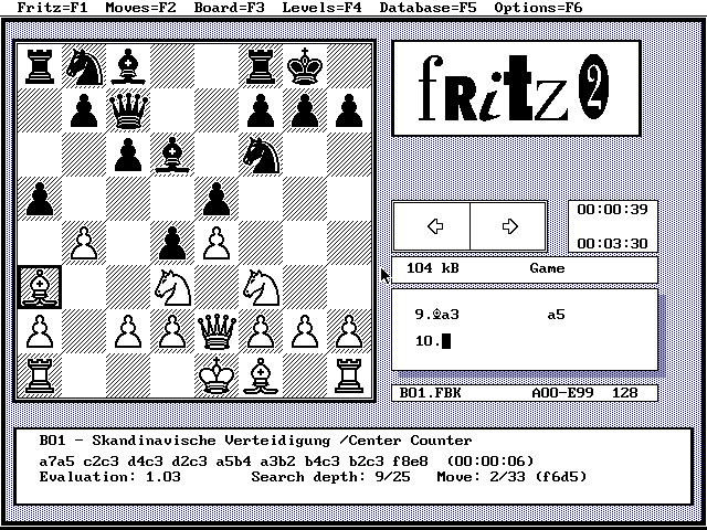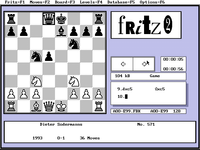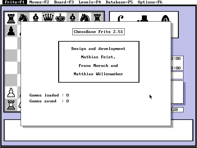 The DOS version of Fritz was developed by Dutch author Frans Morsch in collaboration with the German ChessBase team. Originally sold as a commercial product, this version 2.51 of Fritz has been made available for free with the kind permission from ChessBase. Please visit their website for the most up-to-date chess products and other chess-related information.