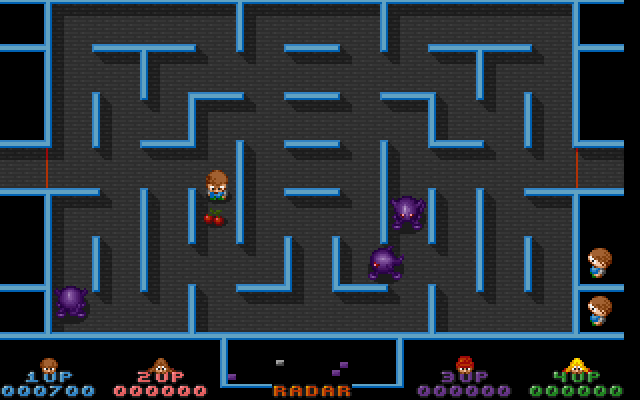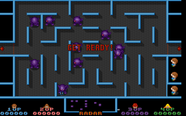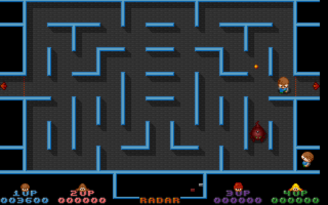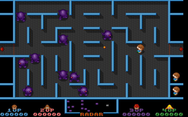 Monsters of Terror is an arcade top-down shooter similar to Wizard of Wor. Up to four players run are put in a maze filled with roaming enemies, with the objective of shooting them all down while staying alive. Bonus items appear at random in different parts of the maze, and more monsters spawn after the initial crowd has been dealt with.