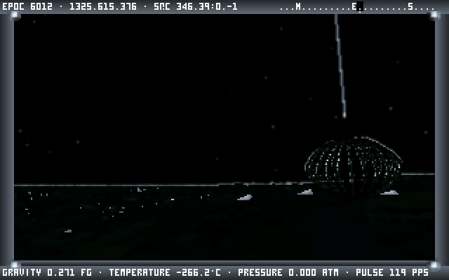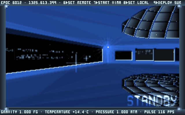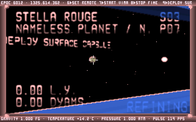 There is no set objective and players can go wherever they want. Pick a star, travel there using "Vimana flight", then you can land on any planet or moon of the star system and freely explore it on foot. There is an option to take screenshots as in-game photographs. The game does not go into complexities of a realistic spaceship simulation, but it is still advised to study the manual before playing.