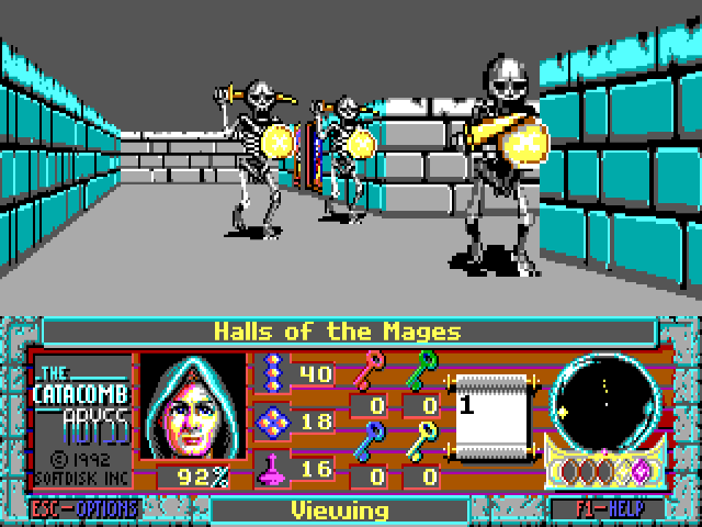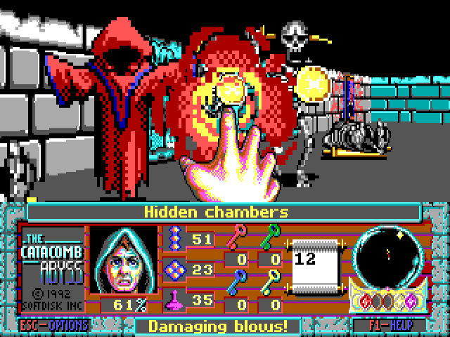 Gameplay in The Catacomb Abyss is very similar to Wolfenstein 3D, except that you fire magic fireballs instead of guns, and destructible walls are used instead of doors. What makes this game stand out is that the levels are much more diverse, and there is a big roster of fantasy creatures as enemies, some specific to only certain levels and environments. There is no automap, but the player has a crystal ball that acts as a radar, and can be upgraded with magical gems to detect certain kinds of monsters. Each level is also split into sub-sections that have names, making it easier to navigate even without a map.
